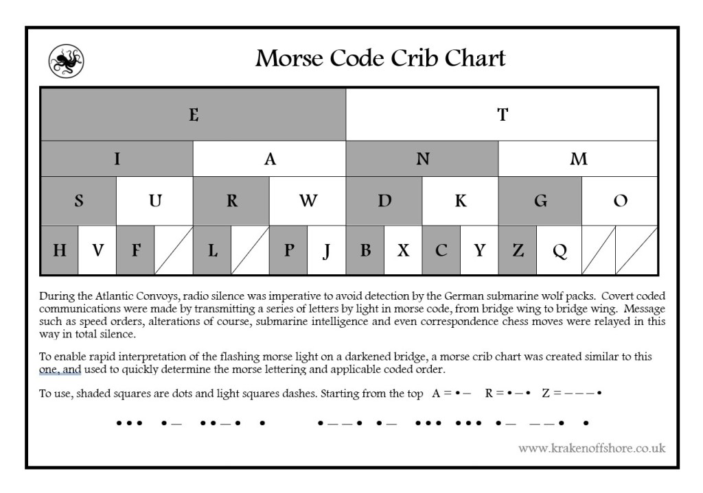 To enable rapid interpretation of the flashing morse light on a darkened bridge, a morse crib chart was created similar to this one, and used to quickly determine the morse lettering and applicable coded order.